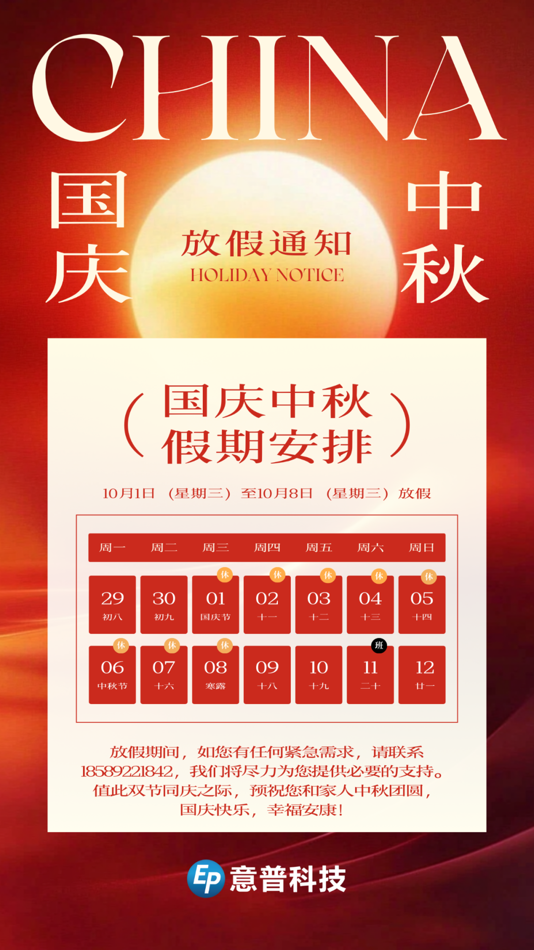 意普科技2025 国庆节、中秋节放假通知